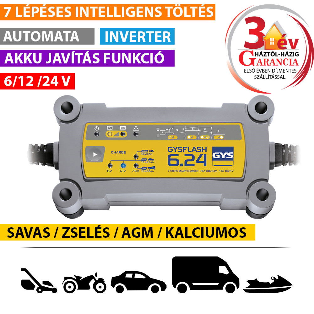 A GYSFLASH 6.24 kifejezetten motorok, autók, gyűjteményautók, haszongépjárművek 6, 12 és 24 V-os akkumulátorának töltésére lett kifejlesztve. 7 lépéses, intelligens töltési görbével rendelkezik, valamint egy töltési opcióval a kis akkumulátorokhoz 15 Ah-ig.